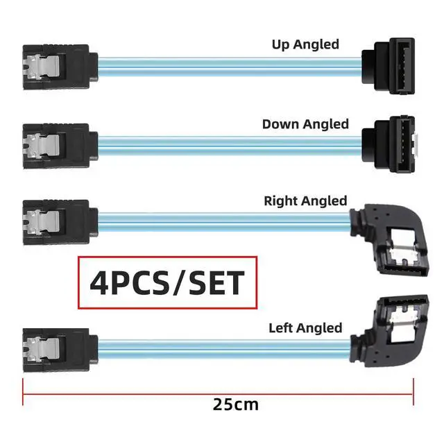 4pcs/lot 90 Degree Angled Type Internal 4-SATA Host to 4SATA 7pin Target Disk 6Gbps Data Server Cable 25cm;;Package included 4pcs angled cable, Left+Right+Up+Down Angled cable, Length 25cm.