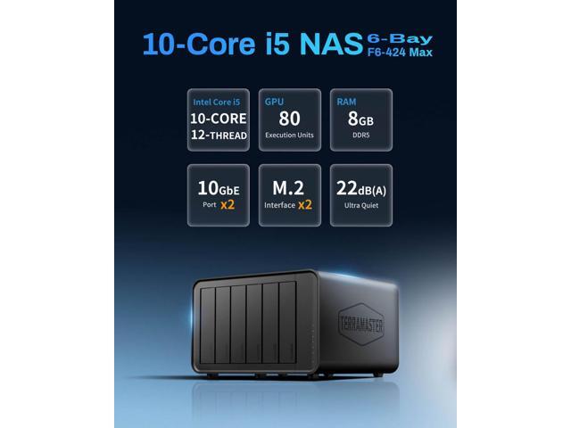 - F6-424 Max Enhanced Performance: 6-bay NAS with Core i5 1235U 10-core processor, Iris Xe Graphics, 8GB DDR5 memory, dual 10G Ethernet ports, and dual M.2 NVMe slots for hyper caching; ideal for SMB virtualization and database tasks with AES NI hardware encryption.