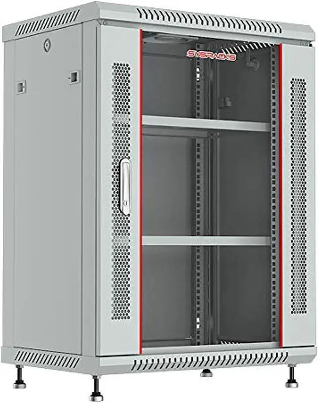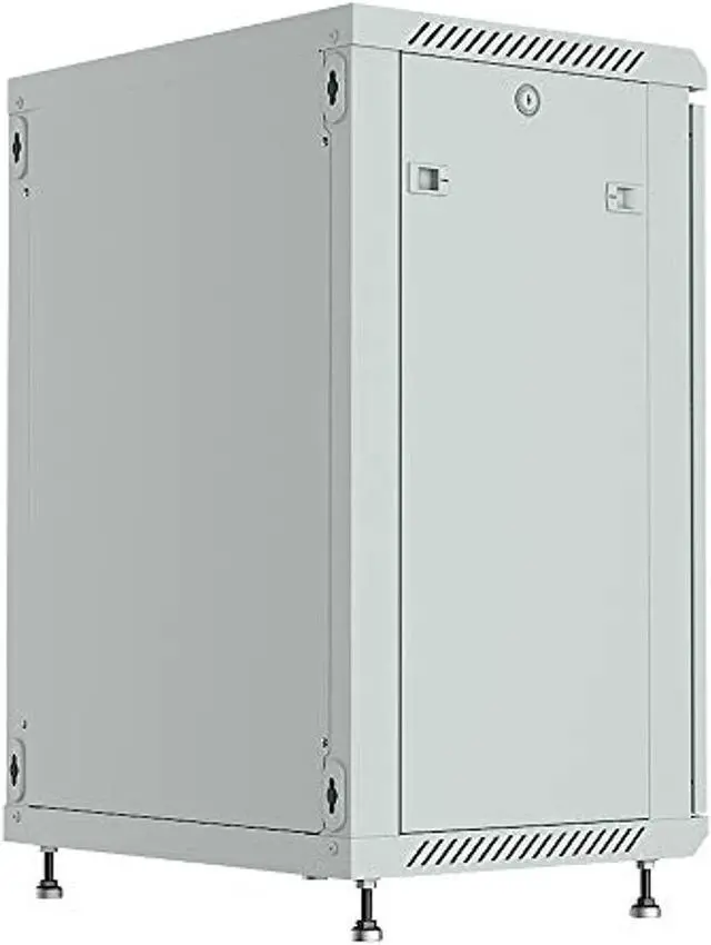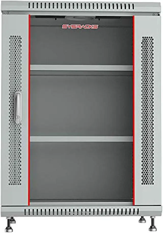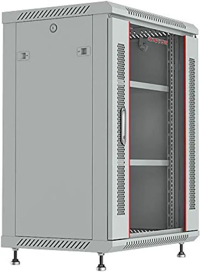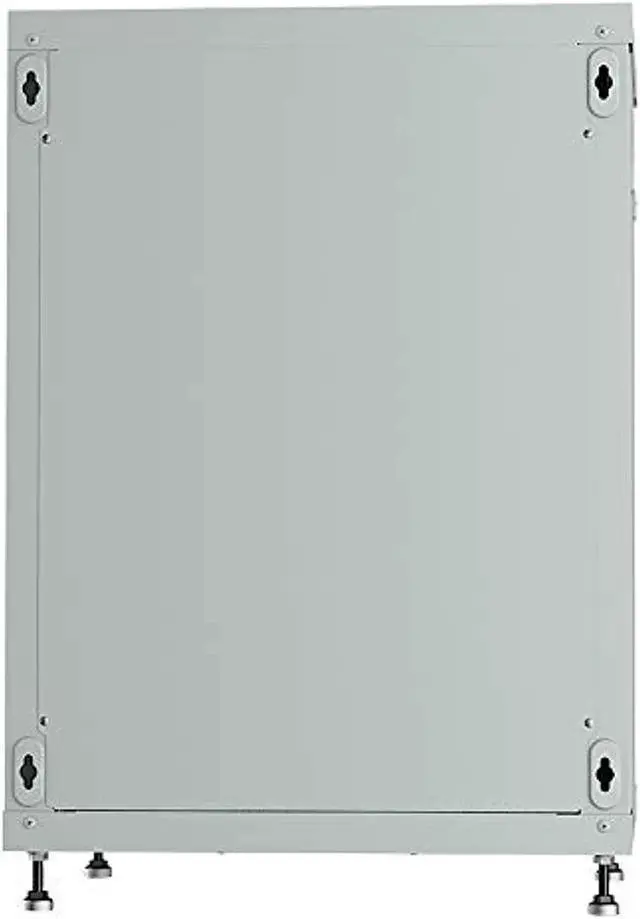 Features: - 4 - Socket Power Bar - Fixed vented shelf - Cooling fan - Standing adjustable feet - Mounting hardware (Set of bolts and nuts -20 pcs) - Brush strip panel for cable input - Glass front door in perforated metal frame - Lockable front door, removable side panels - Lockable latch handle