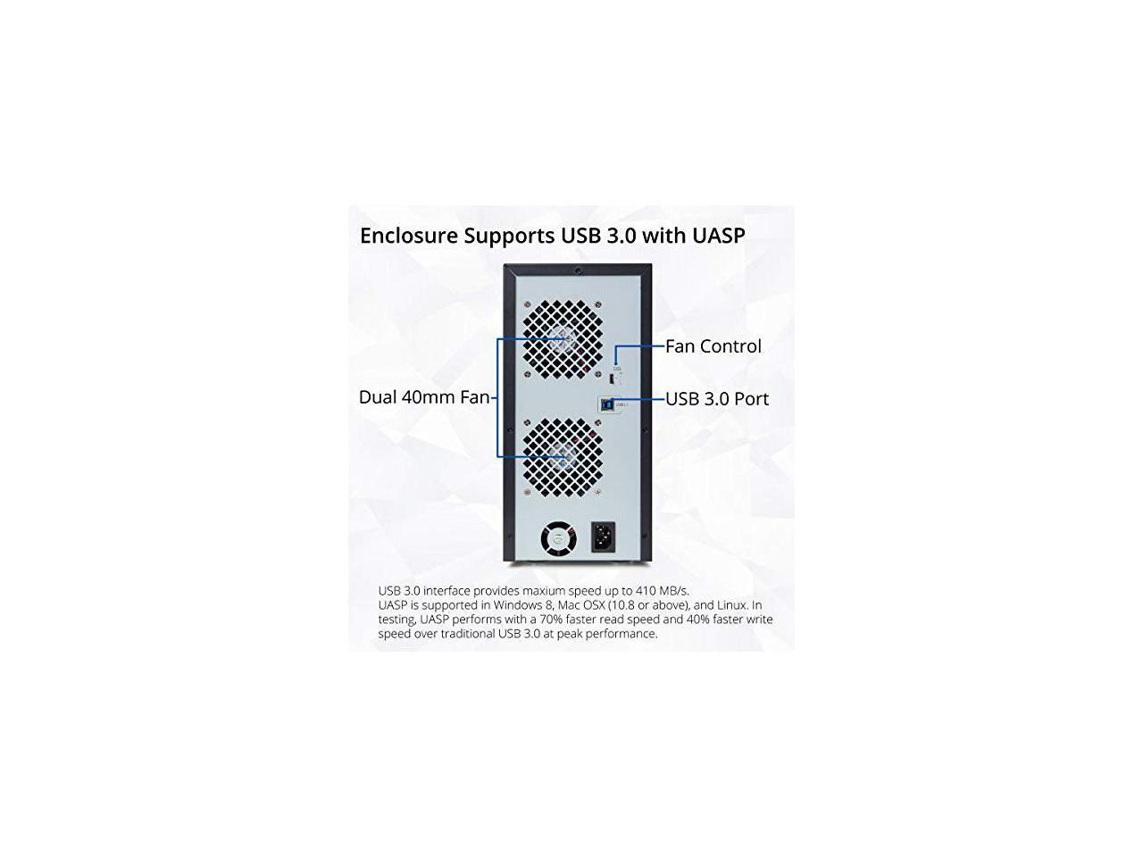 - Support all brands of 2.5 inch and 3.5 inch SATA hard Disk Drive up to 18TB per drive. (Does NOT support RAID and NAS function) Smart Fan function with built-in thermal sensor support Auto and manual mode with 3 level of fan speed Super Speed USB3.0 5Gbps connection transfer your files in a breeze. Supports SATA I/II/iii(6gb/s), UASP and USB 3.0(5Gb/s) Independent control switch for each drive allows drives to be powered off individually. Dissipates heat efficiently with Steel housing and quiet fan To ensure compatibility with your computer system, The SY-ENC50119 supports all of the leading operating systems, including: Microsoft Windows, Apple OSX, Linux, and Google Chrome OS