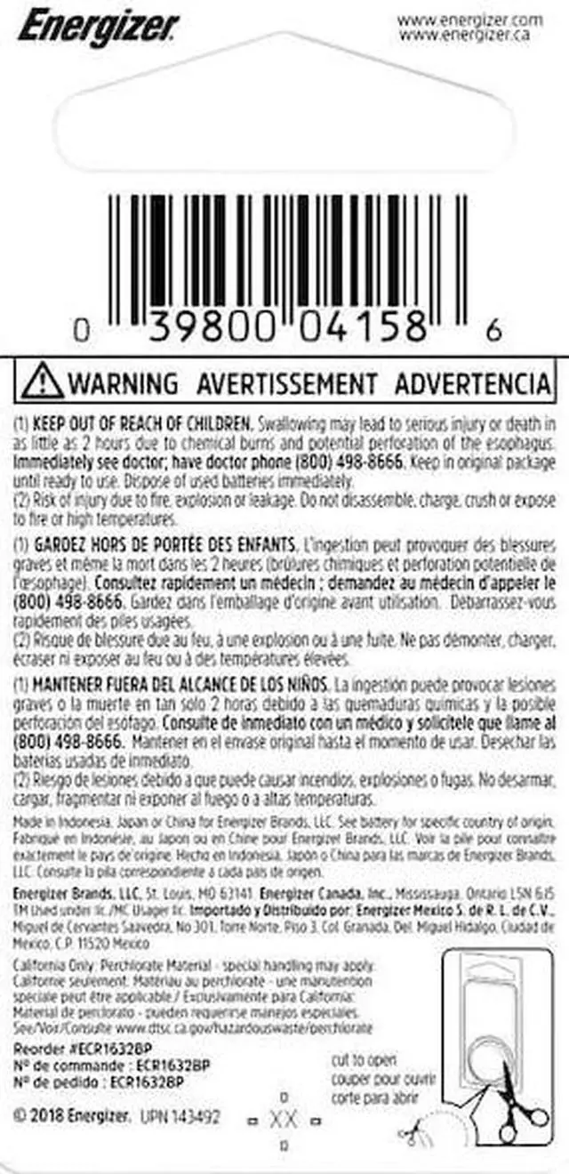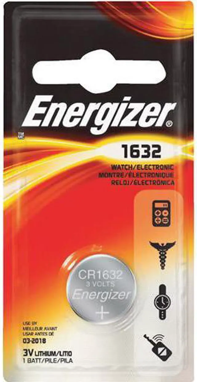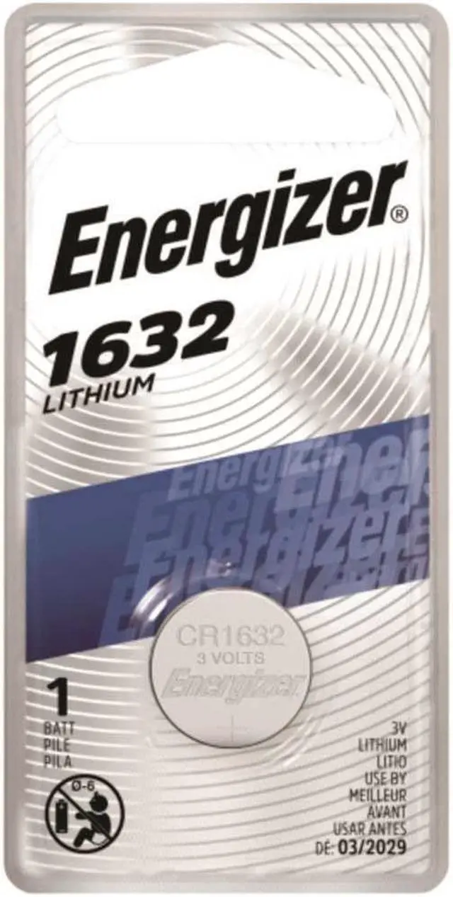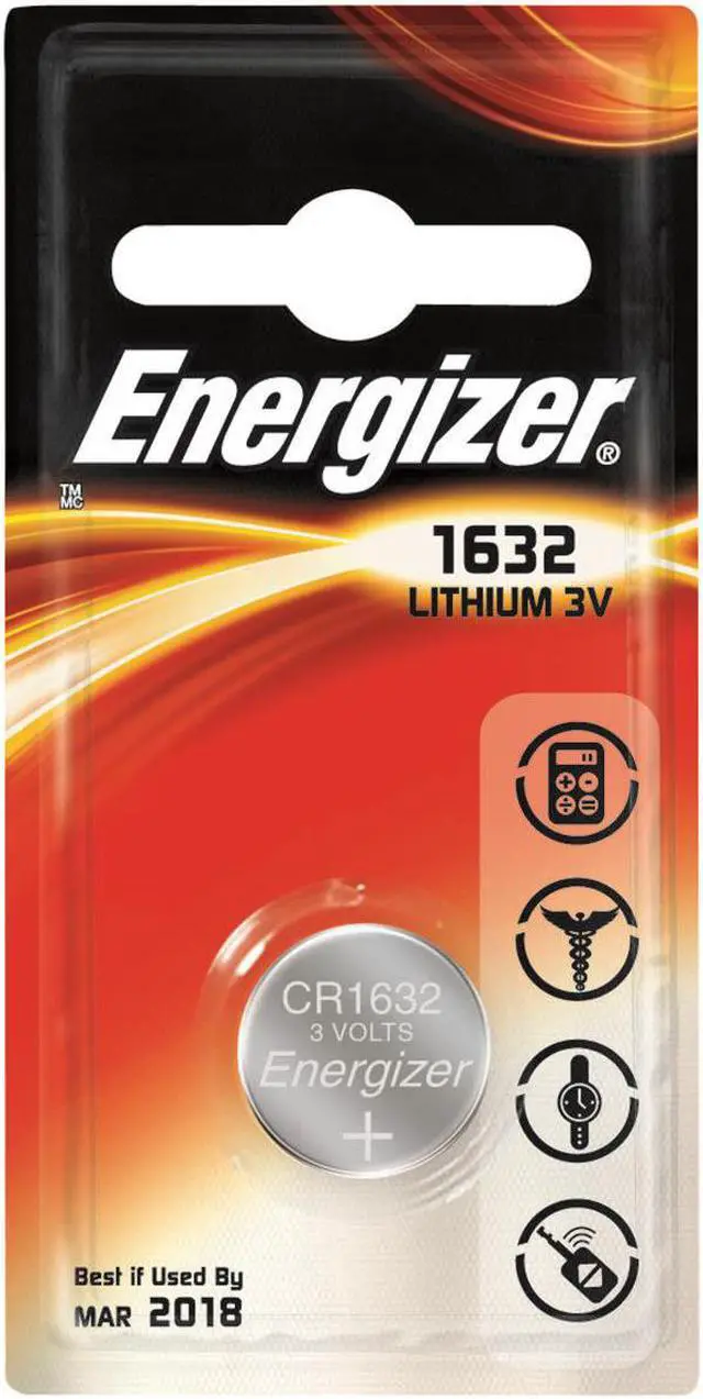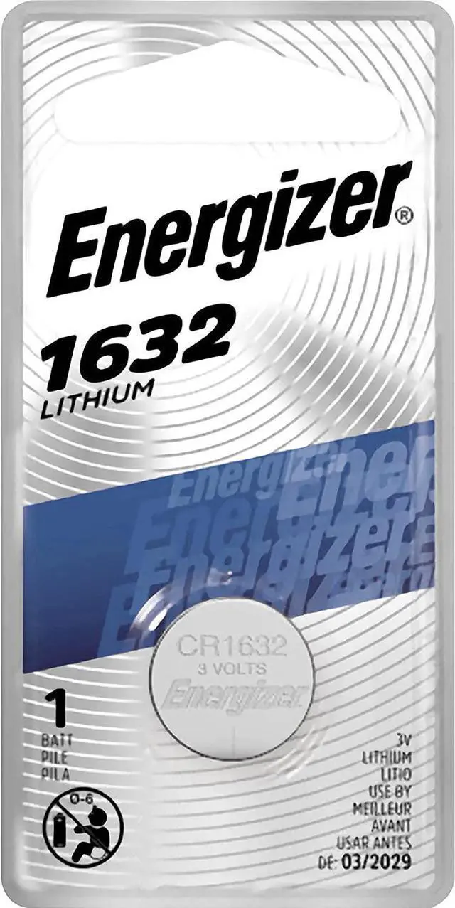 Coin Cell Battery, Battery Size 1632, Battery Chemistry Lithium / Manganese Dioxide, Voltage - Batteries 3V DC, Standard Battery Pack Size 1, Capacity - Batteries 130 mAh, Battery Cross-Reference DL1632, Drain Type - Battery High Drain, Diameter 0.625 in, Depth 0.122 in, Max. Operating Temp. 140 Degrees F, Min. Operating Temp. -22 Degrees F, Standards ANSI, Color Code No Code. This item has been restricted from sale in the following state (s): []