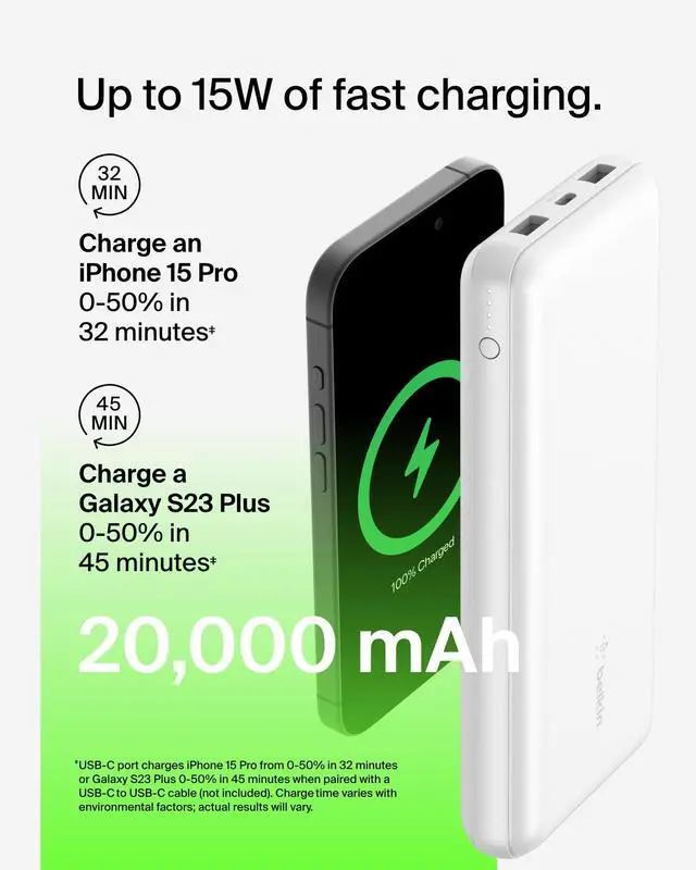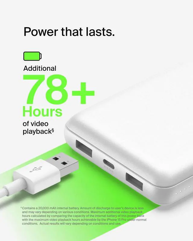 Charge three devices at the same time with our BoostCharge Power Bank 20K. Two USB ports and one USB-C (r) port keep all your devices powered to provide up to an additional 78hours of battery life to your smartphone and smart devices. Binge movies, make marathon FaceTime calls, and keep your navigation apps running to your destination. The included USB-A to USB-C cable lets you start charging right out of the box and recharge your power bank when the time comes. A 2-year warranty and Connected Equipment Warranty provide peace of mind.