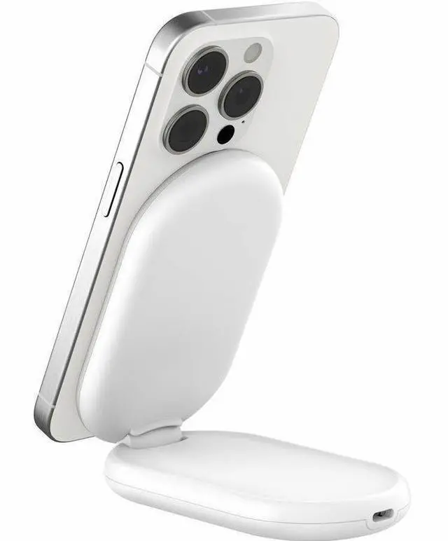 Charge as you like, view your iPhone in stand mode, and fold up for compact storage. Portable charger and folding stand. With its foldable design, this portable charger lets you easily set up shop and adjust your angle anywhere you go - get a quality charge whether you're at home, at work, or the hotel of your next vacation. Premium materials. Qi2 magnetic connection easily aligns your phone, while liquid silicon rubber material provides a soft touch for its protection. Plus, a sturdy, non-slip base keeps the charger in place, and a durable hinge ensures years of use.