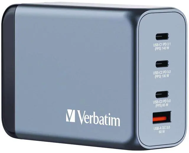 Verbatim's 240W GaN Wall Charger combines three USB-C PD ports and one USB-A QC 3.0 port in a sleek, palm sized design. Ideal for the office, home or traveling, this charger powers your tablet, smartphone, gaming devices, and more. With its foldable US prongs and replaceable EU and UK plugs, it's the ultimate travel companion. Gallium Nitride (GaN) technology delivers high-powered, fast, efficient charging, generates less heat and allows for smaller and lighter chargers, making them ultra-portable. The GNC-240 charger is made with high-quality, flame-resistant materials and features four safety protection systems to ensure your safety while charging.