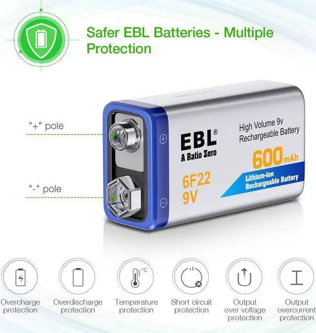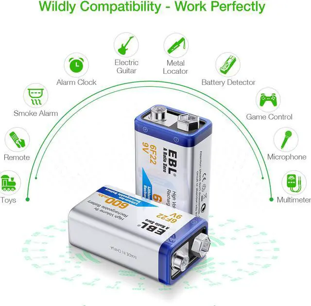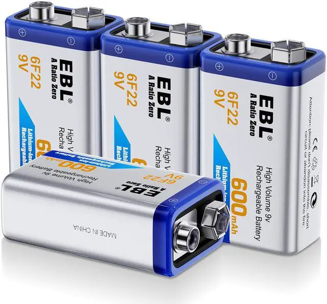 4 x 9V 600mAh 6F22 rechargeable batteries (Charge not included)