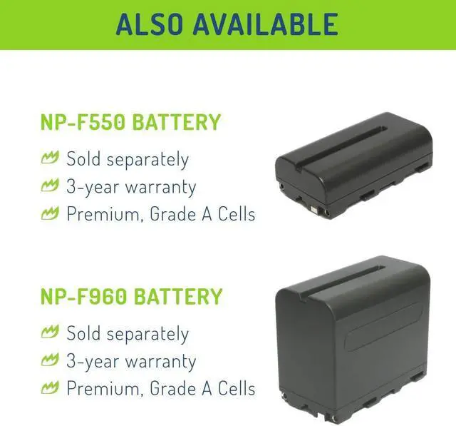 This Wasabi Power battery and charger kit includes 2 batteries and one charger with a European plug and car adapter. All items meet or exceed OEM standards and come with a 3-year manufacturer warranty. Compatibility includes: CCD-SC55, SC65CCD-TR67CCD-TR76CCD-TR87CCD-TR516, TR555CCD-TR716CCD-TR818CCD-TR910, TR917, TR930, TR940CCD-TR3000CCD-TR3300CCD-TRV15CCD-TRV25CCD-TRV36, TRV37CCD-TRV41, TRV43, TRV46CCD-TRV51, TRV57, TRV58CCD-TRV62, TRV65, TRV66, TRV67, TRV68CCD-TRV72, TRV75CCD-TRV81, TRV82, TRV85, TRV87, TRV88CCD-TRV90, TRV91, TRV93, TRV95, TRV98, TRV99CCD-TRV101CCD-TRV215CCD-TRV615CCD-TRV715CCD-TRV815DCR-SC100DCR-TR7000DCR-TRV7DCR-TRV9DCR-TRV110, TRV120, TRV130DCR-TRV210DCR-TRV310, TRV315, TRV320DCR-TRV510, TRV520, TRV525DCR-TRV720DCR-TRV820DCR-TRV900DCR-VX2000DCR-VX2100FDR-AX1GV-D200GV-D700HVL-LBPBHDR-AX2000HDR-FX1HDR-FX7HDR-FX1000HVR-HD1000UHVR-V1UHVR-Z1UHVR-Z5UHVR-Z7UHXR-MC2000UHXR-NX5NEX-EA50UHNEX-FS100UNEX-FS700U