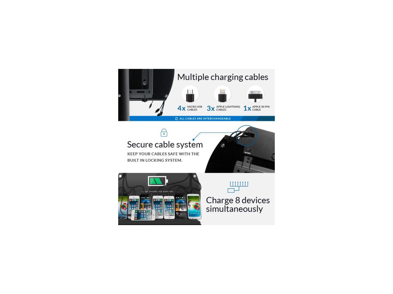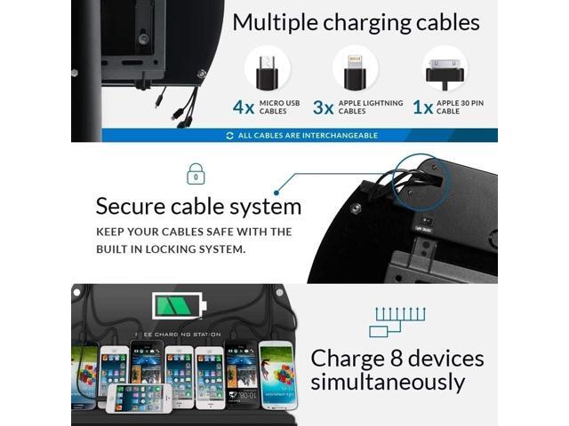 - Comes standard with three Apple Lightning, and four Micro-USB, and one USB Type-C charging cable(s) to accommodate the newest phones and devices on the market