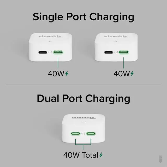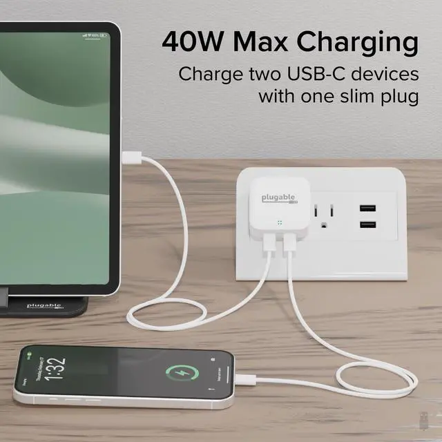 The Plugable 40W Dual USB C Charger (PS-40C2W) is a game-changer for charging on the go (or anywhere, really). Featuring a total output of 40W through its dual USB-C ports, this Type-C USB Power Adapter introduces a smart power allocation system that prioritizes charging to the first device connected, ensuring rapid charging, and then intelligently distributes the remaining power to the second device. Its like a super advanced iPhone Type C charger.