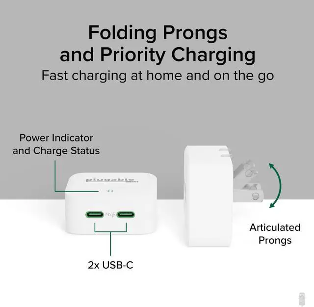 The PS-40C2W has a couple of unique features. First, unlike a traditional PD Charger that sticks out from the wall like a flagpole, this charger has a low-profile design, perfect for throwing in your bag or when you need to plug in behind a desk. Second, and this shouldnt be overlooked, downward-facing ports to minimize wear and tear of your cords. The wall charger for USB C also features foldable prongs for travel, and an LED indicator to communicate charging status at a glance, glowing green for slow charging and blue for fast charging.