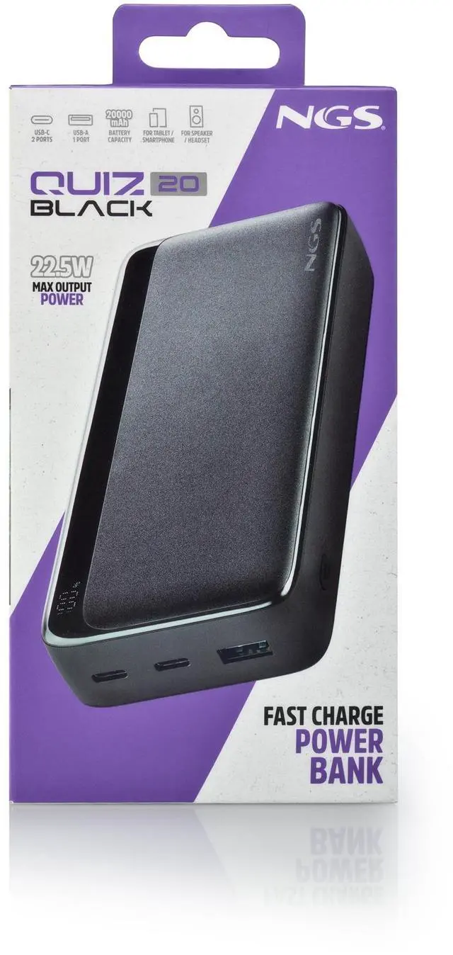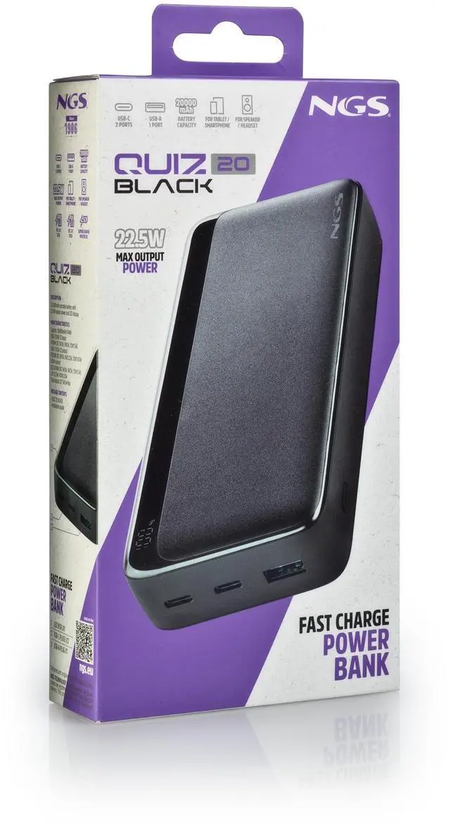 rnThe NGS QUIZ 20 is a high-capacity portable power bank designed for users who demand reliable, long-lasting power wherever they go. With an impressive 20,000mAh battery, it delivers multiple full charges for smartphones and can even recharge tablets, making it an essential companion for travel, work, and everyday use.