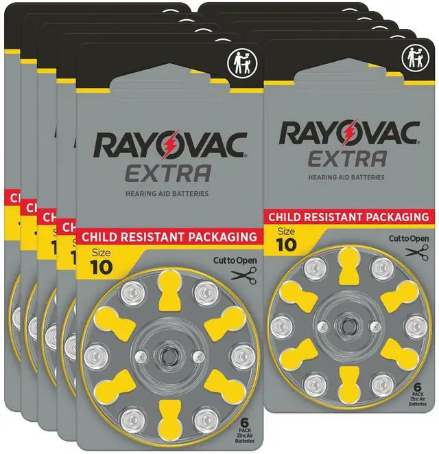 The Rayovac Extra Size 10 (identifiable by its yellow color code) is a high-performance zinc-air battery specifically engineered for modern hearing aids. It is part of Rayovac's premium line, often featuring their "Sound Fusion Technology" for improved durability and performance in high-drain devices like those with wireless streaming.