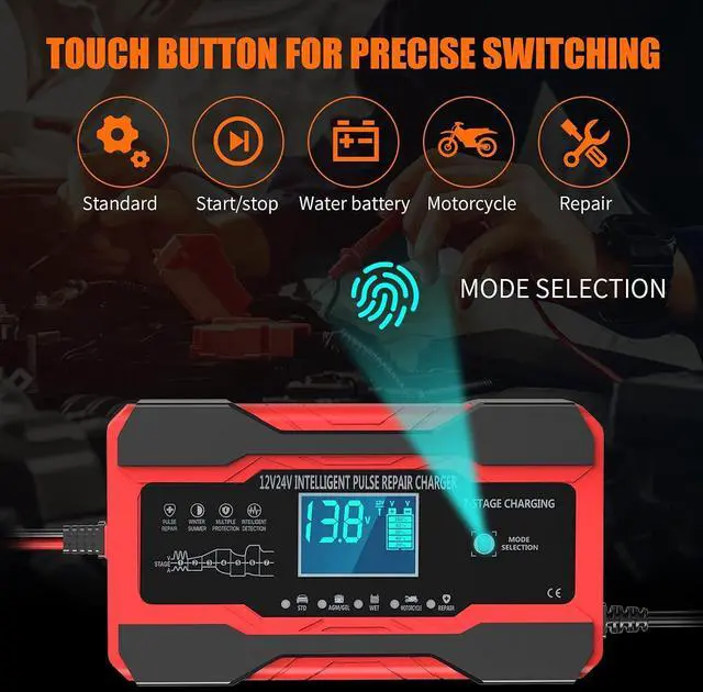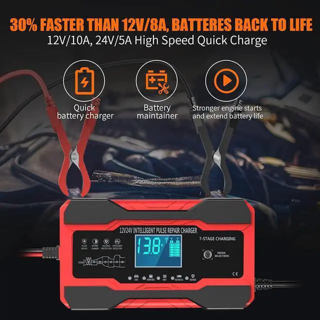 [All in One, Keep your battery charged and your car ready to go] This compact yet powerful 10-Amp 12V/24V smart battery charger is a versatile all-in-one solution, functioning as a charger, maintainer, trickle charger, and desulfator. It works with all 12V and 24V lead-acid batteries, including AGM, GEL, SLA, and Flooded types, for vehicles like cars, trucks, SUVs, motorcycles, lawnmowers, and boats. Note: For 12V/24V automotive or motorcycle batteries only. Not suitable for RC LiPo batteries or laboratory use.