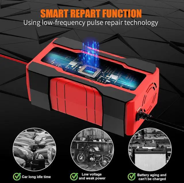 [Restore your Battery, Don't let a dead battery ruin your plans] This battery charger includes an advanced repair mode to revive old or idle batteries and extend their lifespan. Use repair mode if the battery won't charge normally. Its high and low-frequency pulse technology helps restore and activate batteries, but it won't work on completely dead, damaged, or lithium batteries. Input line length:90cm, Output line length:65cm