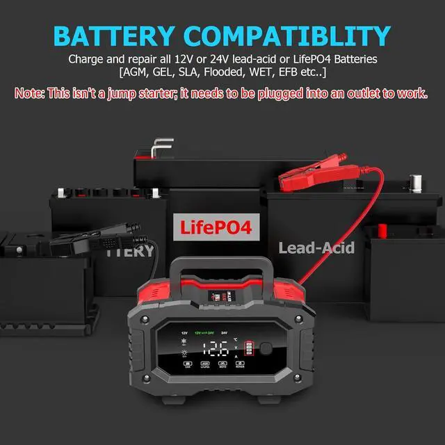 [20A Suitable for LiFePO4 Lead-acid Battery Charger] 12V 20 Amp, 24V 10Amp 7-stage quick battery charger, Designed to charge, maintain and repair all 12-volt and 24-volt lead-acid automotive, LiFePO4, marine and deep-cycle batteries including AGM, GEL, EFB, SLA,Flooded(WET), Calcium in cars, truck, SUVs, ATV, motorcycle, snowmobile, lawn mower, boat, tractor, forklift, golf cart, etc. which is much faster than 10A or 6A automatic chargers. Note: This isn't a jump starter; it needs to be plugged into an outlet to work.