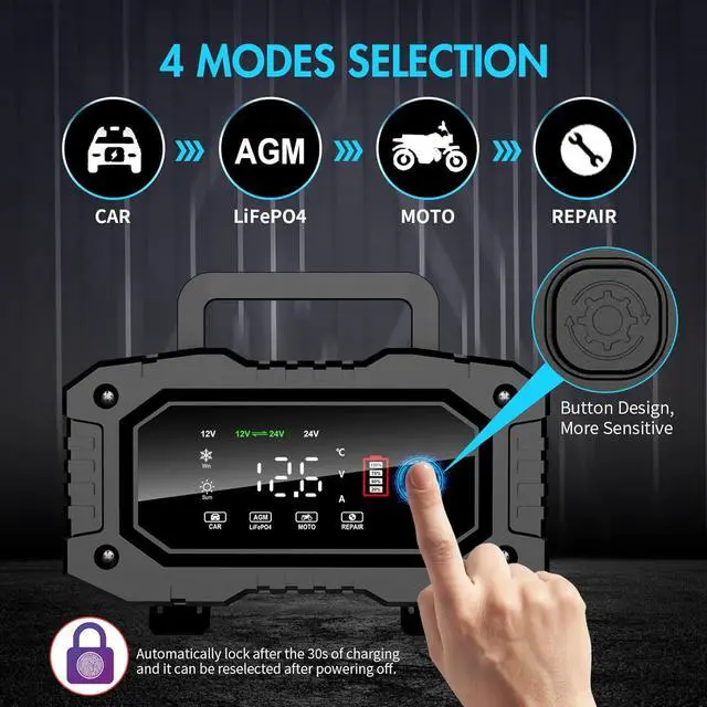 Note: 1. Our product is a car battery charger that requires connection to a power outlet for operation 2. Before use, please carefully read the product manual and select the appropriate charging mode for your battery. 3. This car battery charger cannot charge batteries voltage below 0.3V or batteries that are already damaged. Not compatible with lithium batteries 4. Always check your battery's voltage before attempting to charge. 5. If the battery indicator icon on the charger's display is flashing empty, this indicates that no battery has been detected, and charging will not be possible.