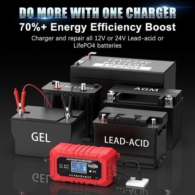 High-Efficiency Pulse Repair Your BatteryThis smart charger features advanced pulse repair technology that automatically detects sulfation and acid stratificationreversing damage to boost performance and extend battery life. Enjoy stronger starts and longer-lasting power. (Note: Cannot revive completely dead batteries.)