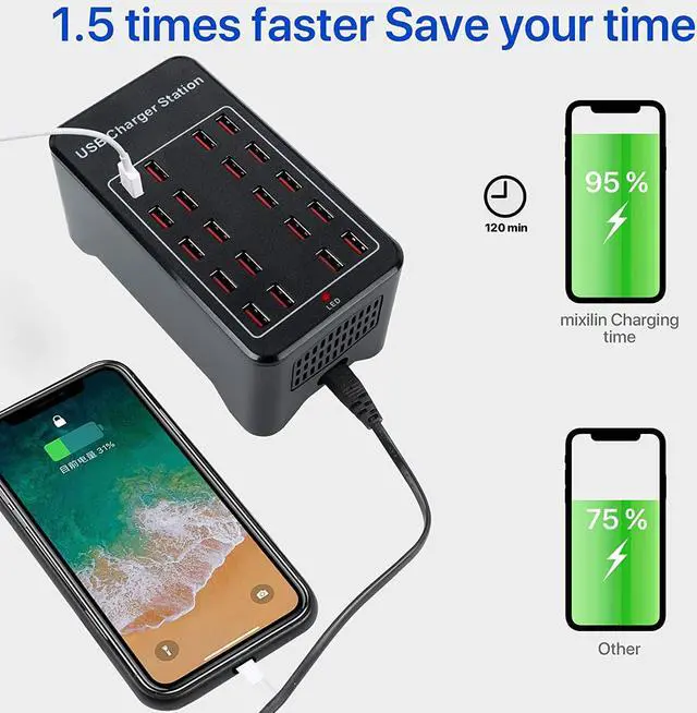 [Multi-port USB charger]-30 ports, working efficiency reaches 80%, each port provides 5V/2.4A power, total output power is 150W. Compatible with iPhone Xs/XS Max/XR/X/8/7/ 6s/Plus, iPad Pro/Air 2/Mini, Galaxy S9/S8/S7/Edge/Plus, Note 8/7, LG Nexus, HTC and Mo