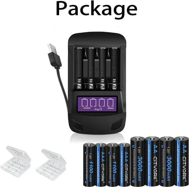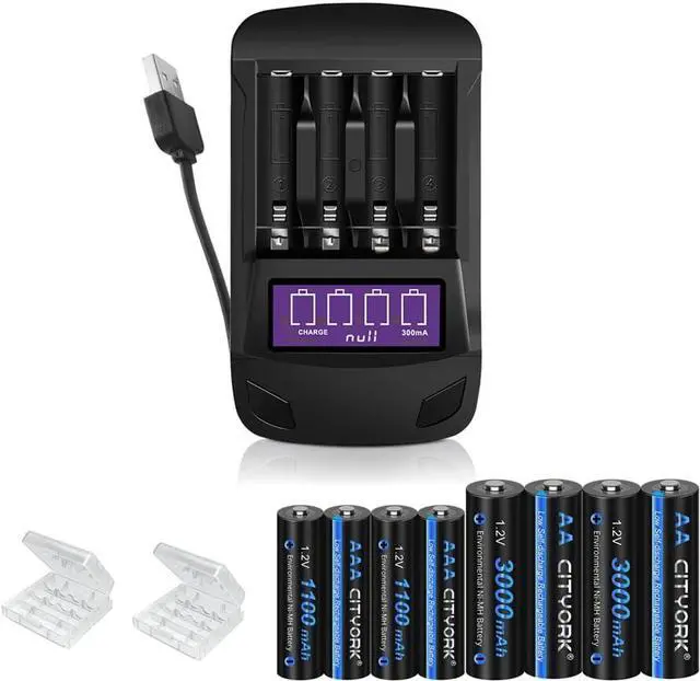 CITYORK 4 Bay LCD Universal Battery Charger for Rechargeable 1.2V AA AAA NIMH Batteries with 4 Pack 1.2V AA 3000mAh and 4 Pack AAA 1100mAh Ni-MH Battery
