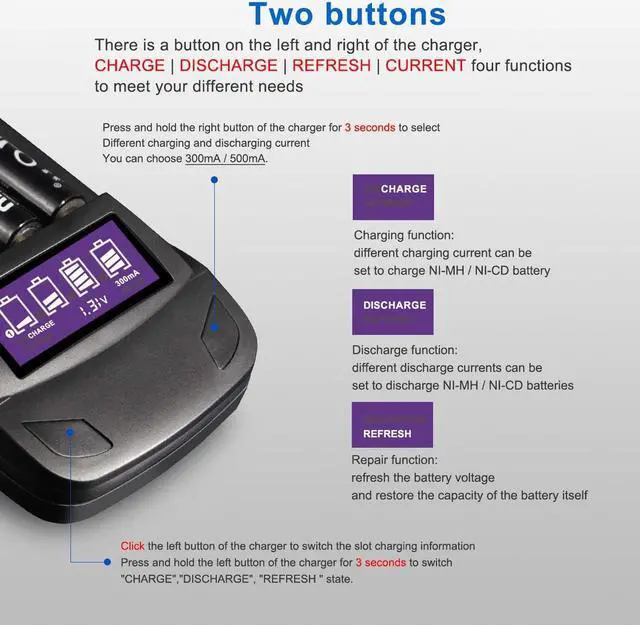 **Refresh Cycle Rechargeable Battery Charger: Easy to use with cycling function, discharge and fully charge your cells to extend their life and overall performance, especially deep cleaning of Nicd