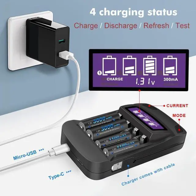 *CITYORK 4 Bay LCD Universal Battery Charger for Rechargeable 1.2V AA AAA NIMH Batteries with 4 Pack 1.2V AA 3000mAh and 4 Pack AAA 1100mAh Ni-MH Battery, Fast Charger (Include Discharge Function)
