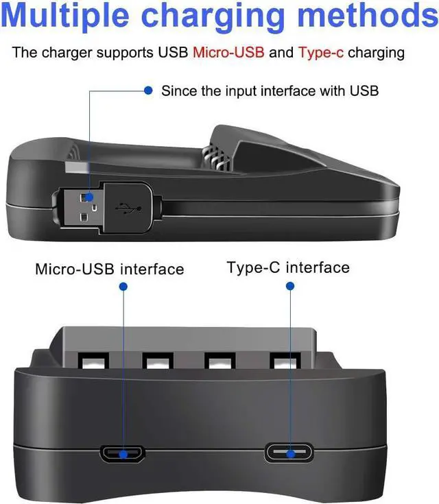 **4 bay charging station - Battery detection technology, automatically turn to trickle charge when batteries are full charged; Advanced MCU control and -V function, over-heat and over-current protection, short-circuit protection, non-rechargeable and defective battery detection.