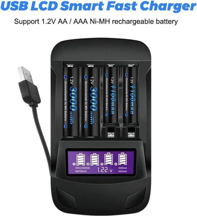 Package Contents: 4 x 1.2V AA Ni-MH 3000mAh + 4 x 1.2V AAA Ni-MH 1100mAh Rechargeable Batteries with 4 Bay battery charger + 2 x Battery Case.