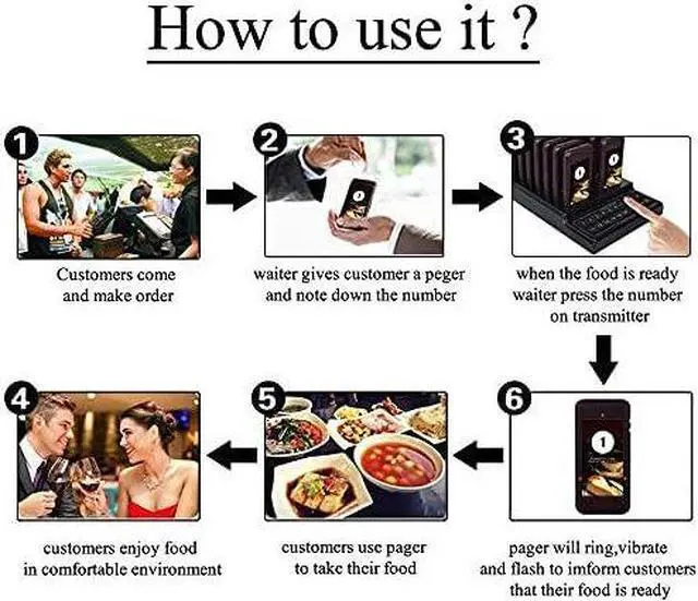 Why you use: Improve work efficiencyand enhances the restaurant'image; Minimize crowds in waiting line and Reduce staff chaos; Notify people faste and Reduce staff chaos & improve ambience.