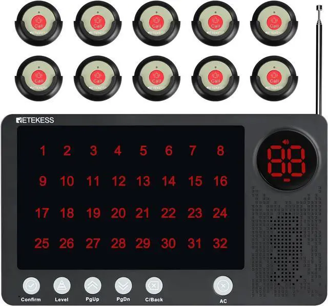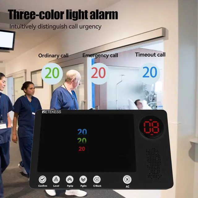 Delete call records; after patient press the alert button; the nurse can delete the designated call records and all cal records according to choice5 adjustable volumes; caregiver call button for nurses station has 5 levels of volumeinclude mutefor adjustment plus 10 languages voice alert; select a peaceful melodic tones chime alert sound of your choice3 call grade; green color is ordinary call; red color is emergency call; the blue color is timeout call; you can choose different color call according to the degree of urgencyIP67 waterproof; offers protection for the caregiver pager; you can completely install it on the wall of a kitchen or bathroom without worrying about water dripping on it and damaging itEasy to expand; the hospital paging system is capable to pair up to 256 call buttons; you can add the call button according to your needs