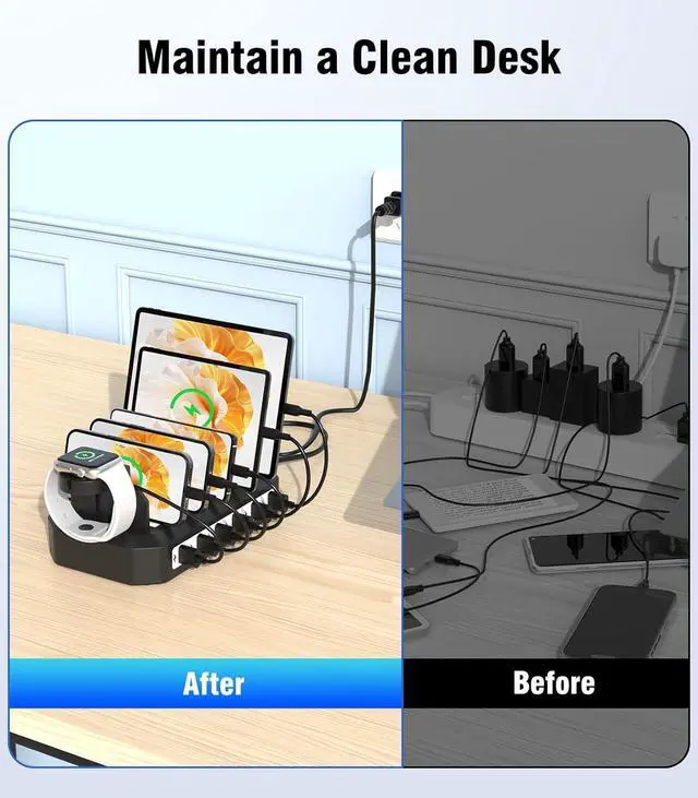 Smart and Practical DesignThis USB charging station features a well-thought-out design, optimized for use in homes, offices, meeting rooms, living rooms, bedrooms, kitchens, hotels, and classrooms. The iphone and watch charging station compact and organized layout ensures a convenient and clutter-free charging experience wherever you need it