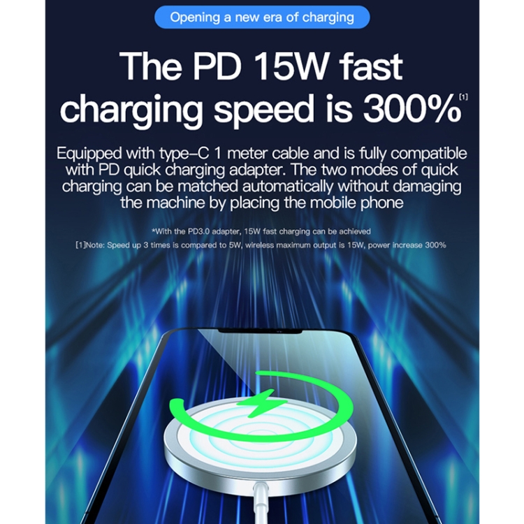 1. Material: Aluminum alloy + TPE 2. Wireless output: 15W max (compatible with 10w, 7.5W and 5W) 3. Support iPhone12 mini/Pro/Pro Max wireless charging 4. Comes with Type-C 1 meter cable, fully compatible with PD fast charging charger, two fast charging modes, it can be automatically matched when put on the phone, fast charging does not damage the phone 5. With PD3.0 adapter, 15W fast charge can be achieved