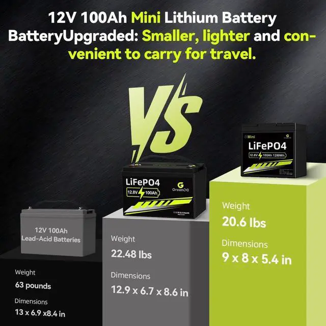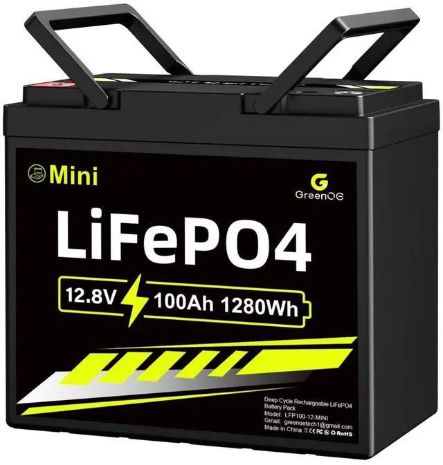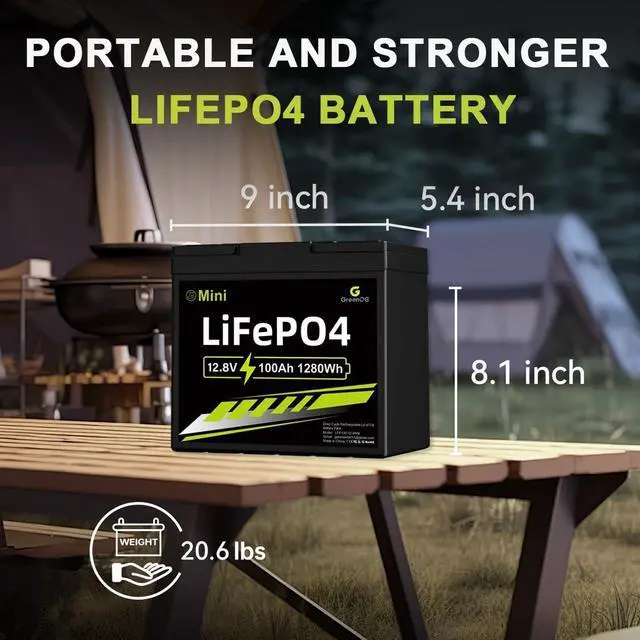 - [Mini Size]GREENOE 12V 100Ah MINI LiFePO4 battery measures in 9.0x5.4x8 inches,the weight of our battery is only 20.6lbs,Lighter and more convenient to carry,No more worries about overweight and limited capacity.