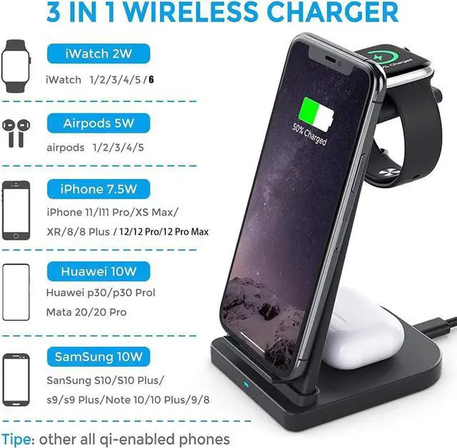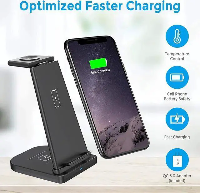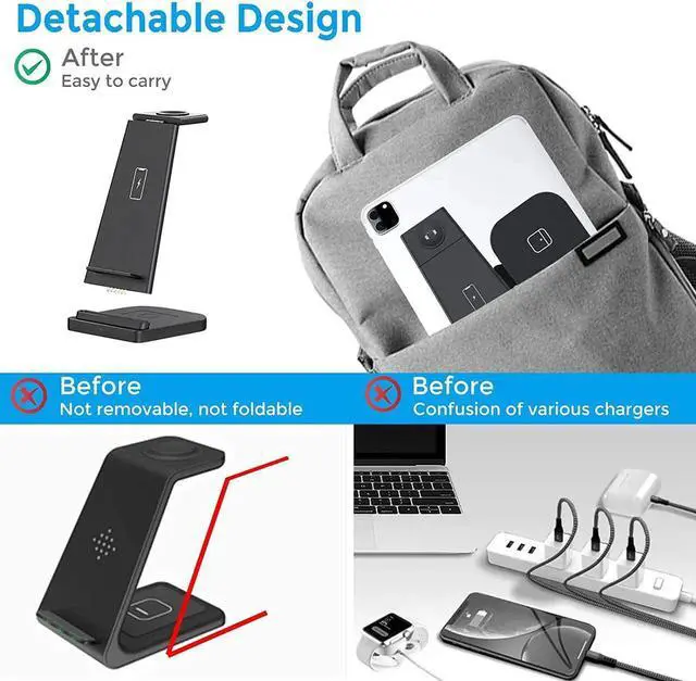 3 in 1 Wireless Charger Stand --- Cable-Free. No messy cables,makes your office clean and tidy. 3 in 1 wireless charger supports vertical or horizontal wireless charging for better viewing of watching movies, live chatting, etc.