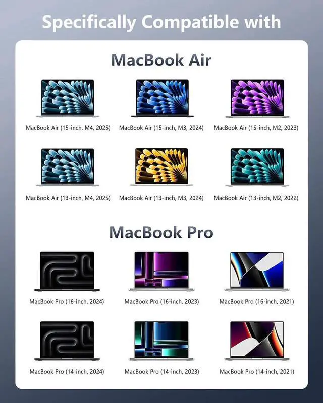For MacBook Air (13-inch,15-inch, M4, 2025); MacBook Air (13-inch,15-inch, M3, 2024); MacBook Air (15-inch, M2, 2023); MacBook Air (13-inch, M2, 2022); MacBook Pro(14inch,16inch, M4, 2025); MacBook Pro (14inch,16-inch, M3, 2024);MacBook Pro(14inch,16inch, M2, 2023); MacBook Pro (14inch,16-inch, M1 2021).