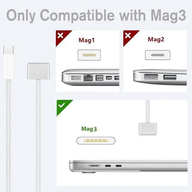 Compatible with Macbook:This USB-C to Magnetic 3 Cable only Compatible with MacBook Air (13-inch, M4, 2025),MacBook Air (15-inch, M4, 2025),MacBook Pro (14-inch M4,2025), MacBook Pro (16-inch M4,2025),MacBook Air (13-inch M3,2024), MacBook Air (15-inch M3,2024),MacBook Pro (14-inch, M2, 2023), MacBook Pro (16-inch, M2, 2023), MacBook Air (15-inch, M2, 2023), MacBook Air (13-inch, M2, 2022), MacBook Pro (14-inch, 2021), MacBook Pro (16-inch, 2021),Please check your computer model to make sure it matches the charging cable.