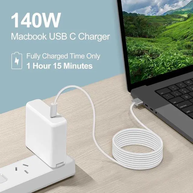 140W PD Fast Charging: Ensure your MacBook charges quickly. Whether you are working or playing computer games, this macbook air charger cord ensures the power you need. It only takes 30 minutes to fully charge 50%. It is recommended to use a 96W or 140W power adapter to charge the MacBook for fast charging.