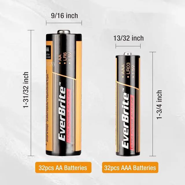 Reliable Power Solution: Energize your devices with the EverBrite 64pc Alkaline Battery Pack. Includes 32 AAA and 32 AA batteries for long-lasting power.