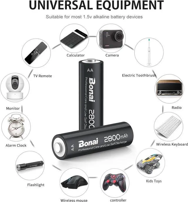 BONAI rechargeable AA batteries are great for TV, Xbox controllers, Children' s toys, mouse, camera flashes, wireless mic system, outdoor solar lights and other devices with high battery turnover, supplying power for your household devices
