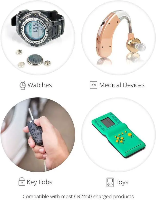 COMPATIBLE: Our cr 2450 batteries lithium 3v should be compatible with devices using any of the following: DL2450, ECR2450, GPCR2450, CR 2450, BR2450, BR2450, KCR2450, LM2450, 5029LC, CR-2450EL, CR2450N, LITH-34, LiR2450
