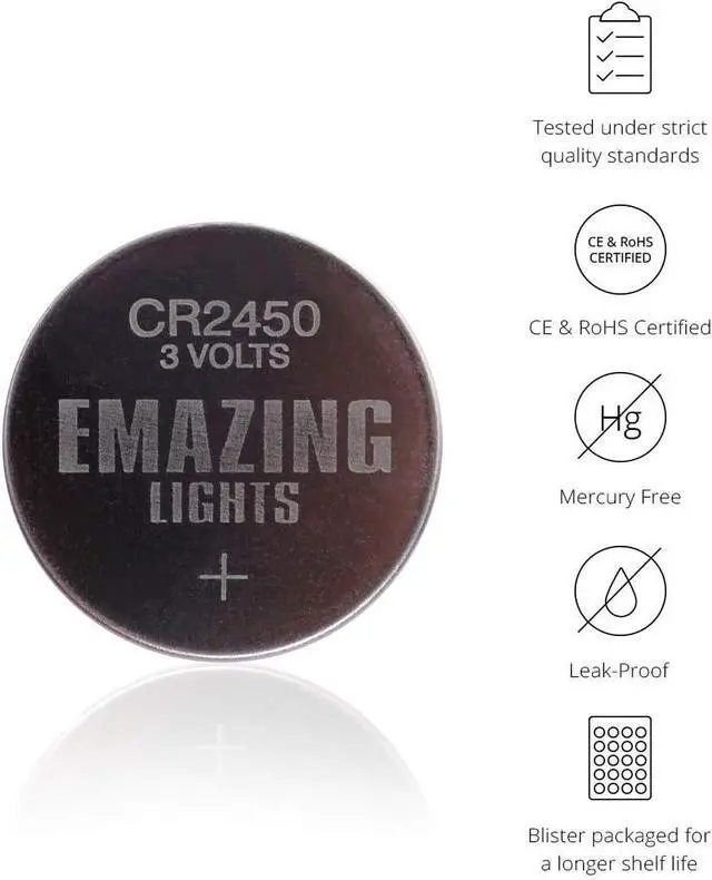 Keep your electronics charged with our premium 2450 lithium battery. Our Grade A cr 2450 battery has been tested under strict quality standards and is CE and RoHS Certified