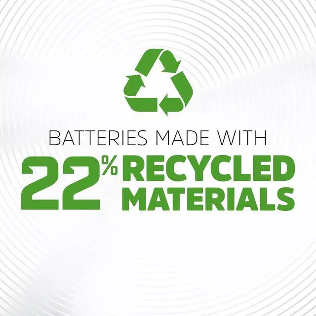 Energizer NiMH batteries in this AA battery pack made with 22% recycled materials and the chargeable batteries are designed to prevent leaks