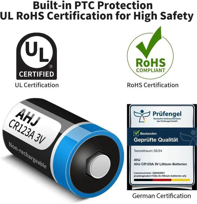 ULTRA SAFE -. Built-in multiple protections (over pressure, over-temperature, over-current & over-voltage protections ). Besides, the unique safe air hole in each CR123A battery, explosion-proof cap and thicken steel shell design make these CR123A lithium batteries anti-corrosion, anti-explosion and anti-leakage. UL, CE, ROHS certified, just feel free to use it.