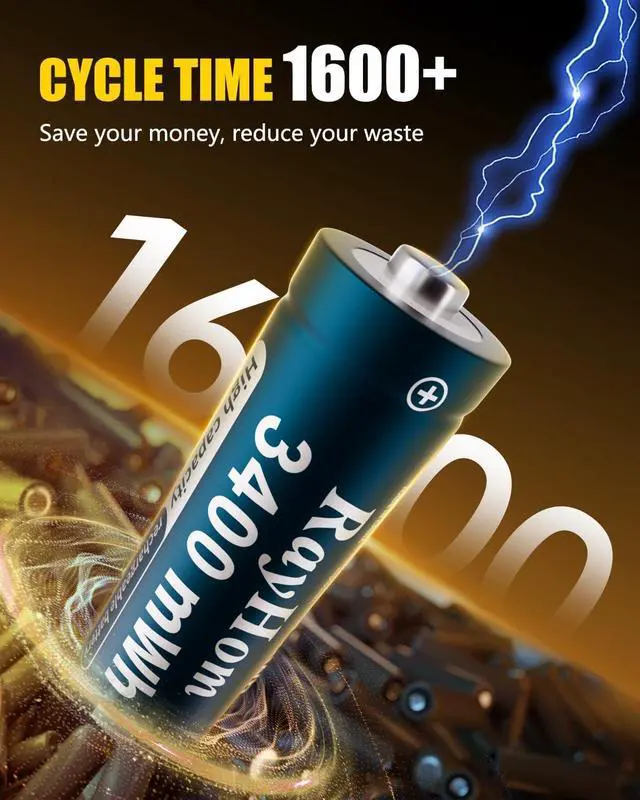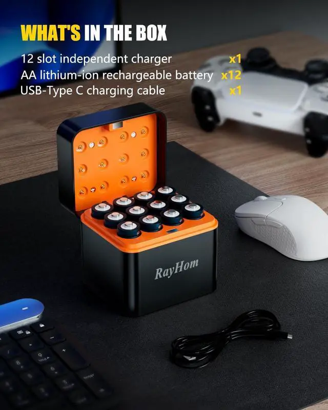Complete Charging SystemIncluding 12x3400mWh high-capacity rechargeable AA batteries and an advanced 12-slot lithium battery charger. Each charging solt operates independently, allowing flexible charging from 1 to 12 batteries simultaneously with smart V cutoff technology.
