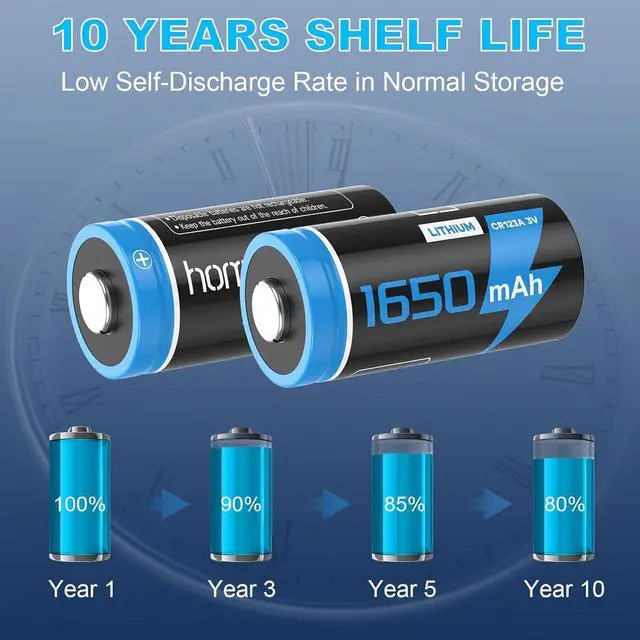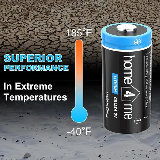 10 Years Shelf Life Home4me 123a lithium batteries are guaranteed for 10 years in storage and also hold great performance in temperatures ranging from -40 to 185. Stay prepared for emergencies without worrying about battery degradation