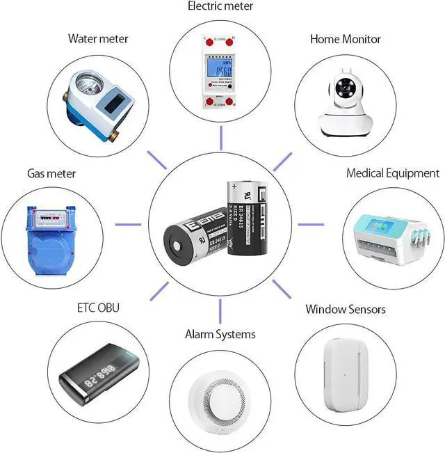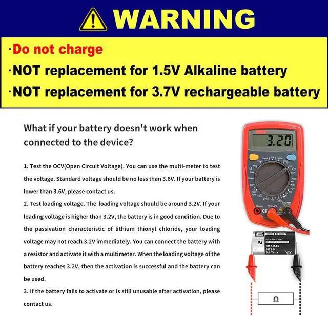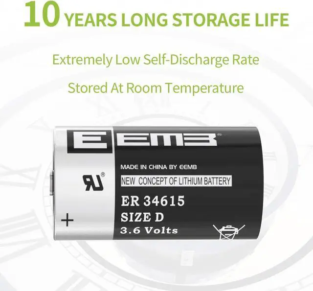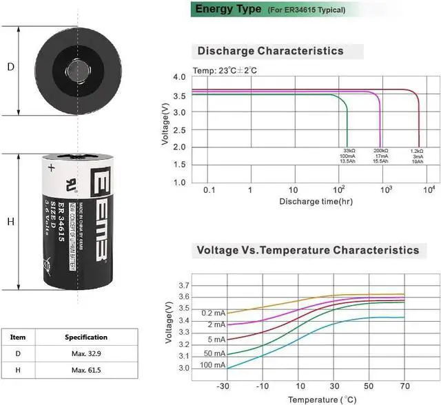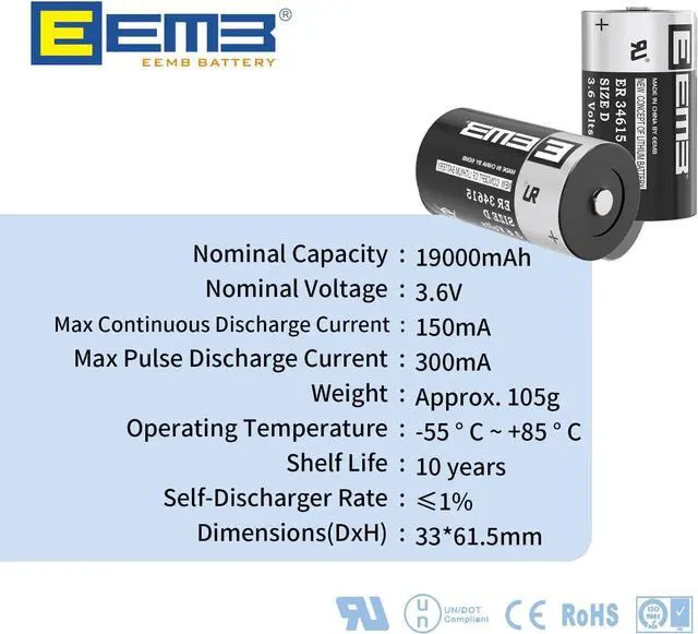 BASIC INFO 3.6V non-rechargeable d size lithium thionyl chloride battery; 19000 mAh; 33* 61.5 mm/ 1.3 * 2.42 inch, wide range of temperatures -55°C to +85°C; most suitable for low power consumption devices. please check carefully if the ER34615 battery is the size you need for your electronic device before purchasing.