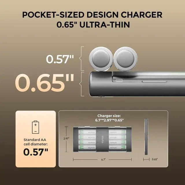 Ultra-Slim Charger for On-the-GoThis imuto AA battery charger with 8 pack aa lithium batteries is one of the thinnest chargers on the market, only 0.65 inches thick, while the diameter of a standard AA battery is 0.57 inches. The thinner and more compact design provides better convenience for carrying out.
