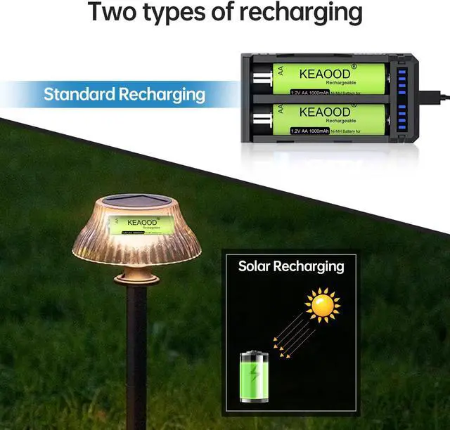Solar and Standard Charging Rechargeable aa solar batteries can be charged using solar lights or a household battery charger. For better performance, use a battery charger to ensure full charging when sunlight is not enough.