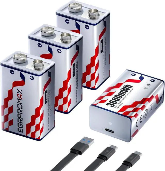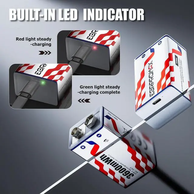 Convenient USB-C Charging Design: These 9V Batterien uses a 2-in-1 USB-C fast charging cable, which can be charged directly anywhere without additional charger. The built-in LED light allows you to check the charging status.