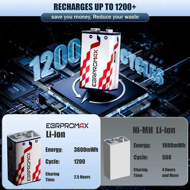 1200+ Recharge Cycles Built to Last for YearsEngineered to withstand over 1200 full charge and discharge cycles, these 9V rechargeable lithium batteries outlast thousands of disposable batteries. Ideal for households that want to save money and reduce battery waste without sacrificing performance.