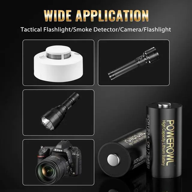 Wide Application - POWEROWL CR123A 3V lithium battery are well used for common applications like cameras, flashlights, smoke detectors, microphones and more.