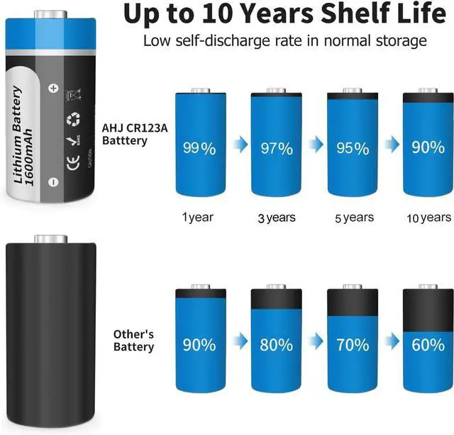 10 YEAR SHELF LIFE - Low self-discharge rate ensures AHJ CR123A battery cell up to 10 year shelf life (self-discharge rate1% in normal storage, without any memory effect), don' t worry about the CR123A 3V battery will expire and waste your money. Great performance during extreme weathers ranging from -49 °F to 185 °F / -40 °C to 85 °C.